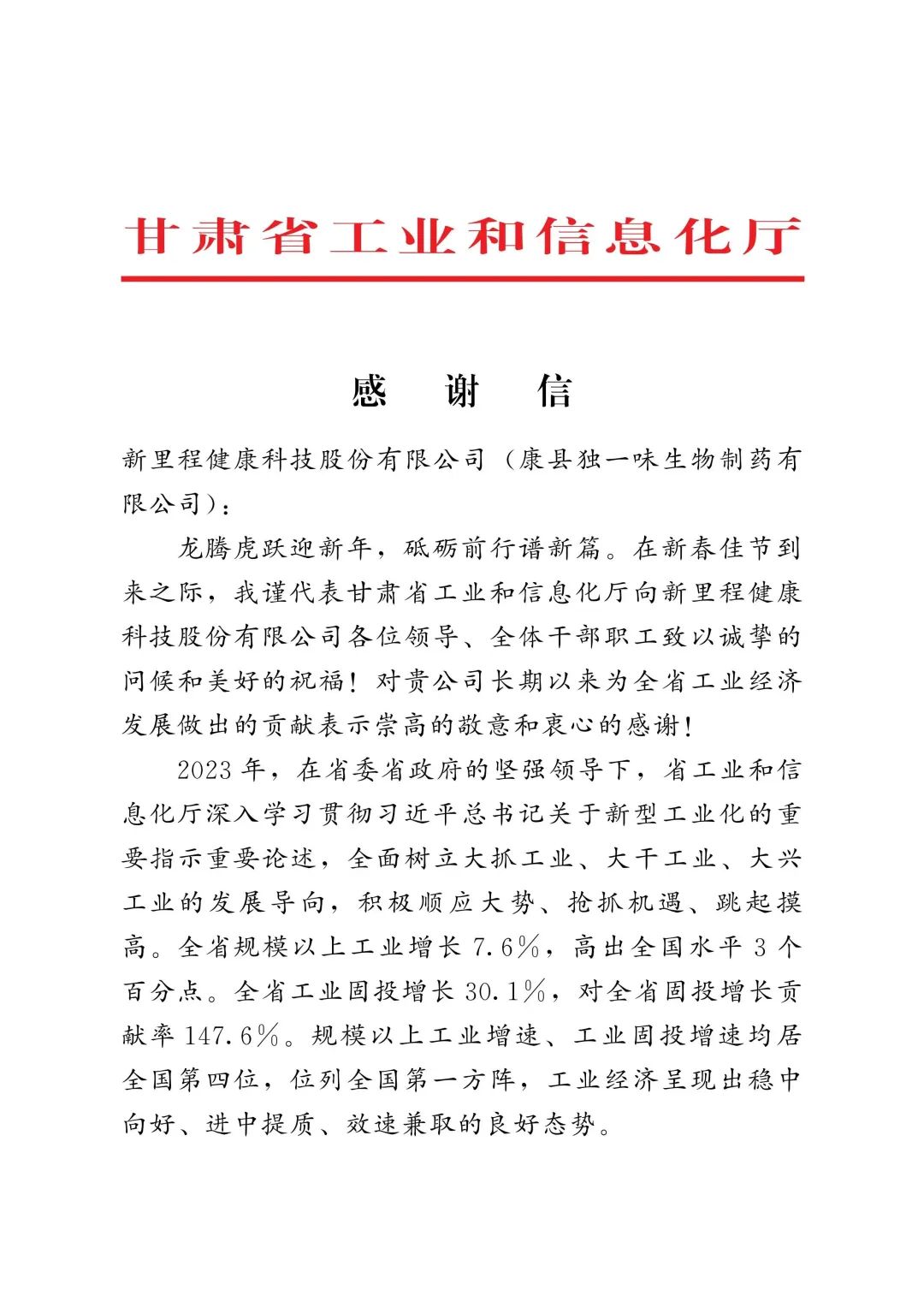 近日,甘肃省工业和信息化厅向英国威廉希尔公司官网健康科技股份有限公司 (康县独一味生物制药有限公司)发来感谢信,对独一味制药长期以来为甘肃省工业经济发展做出的贡献表示崇高的敬意和衷心的感谢。这一认可不仅是对独一味制药过去一年工作的肯定,更是对独一味制药未来发展的鼓舞和激励。
